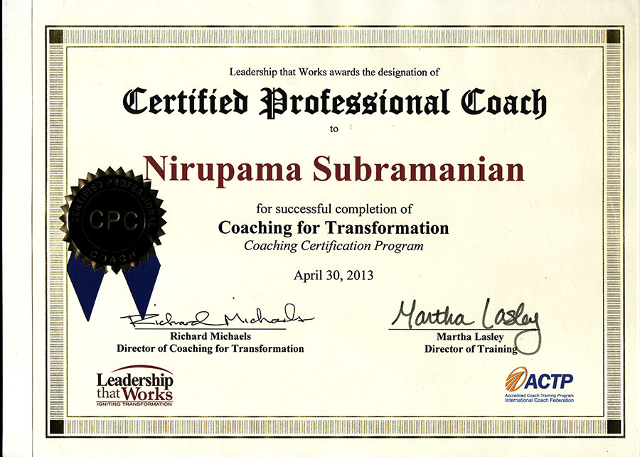Nirupama as a coach helped me identify my core values that define my identity and through some very probing questions took me through a journey which was enriching and an eye- opener. As a coach, Nirupama has access to and mastery over various tools and techniques but she always ensured that I was not lost or confused in the jargon or science. Through these tools, she helped me see linkages between various wish-lists and wants and identify real obstacles or “hold” on self. Thanks to her, today I am lot more confident in dealing with various scenarios at office and in a positive frame of mind. In my experience to get maximum impact from coaching just – “Have Faith and Start the Journey along with Your Coach